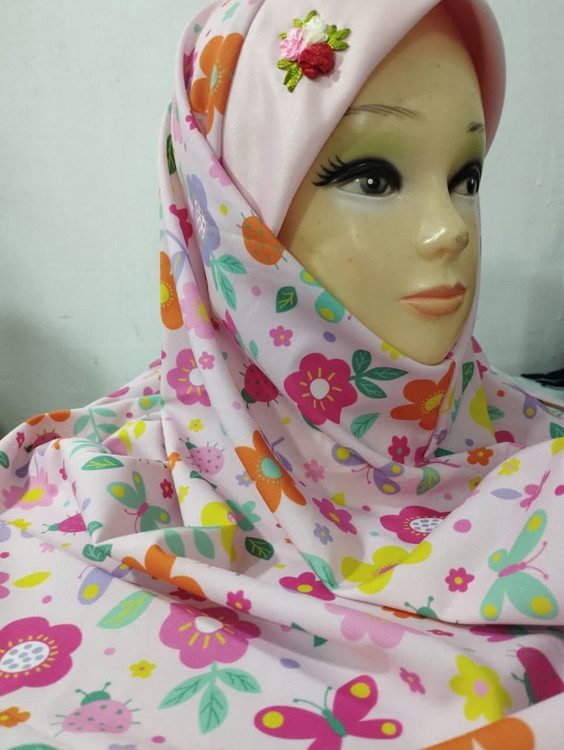 مقنعه دخترانه طرح گل و پروانه زمینه صورتی مناسب 1 تا 10 سال