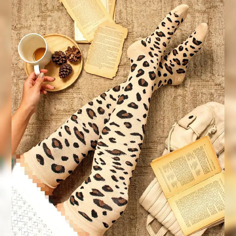 جوراب بالا زانو زنانه طرح پلنگی کرم