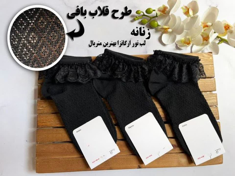 جوراب مچی لب تور مشکی طرح قلاب بافی مناسب بالای 10 سال